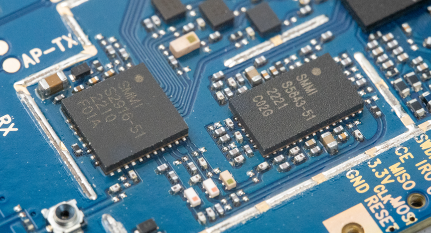 它旁边配了两个射频功放AP芯片,分别是S5643-51和S2916-51。前者集成了LB、MB、HB三路高性能PA,支持LTE sub-3GHz所有主流频段。后者集成了2路GSM PA及SP16T开关等器件,支持高功率的信号接收和发射。