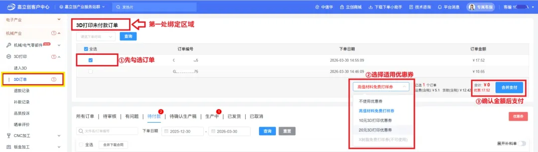 1、进入嘉立创客户中心→机械产业→3D打印→3D订单页面,按如下操作绑定优惠券: