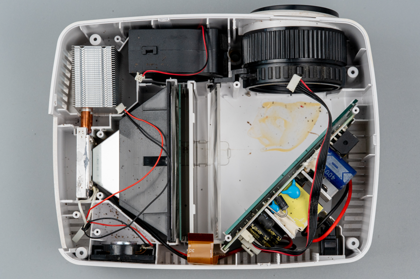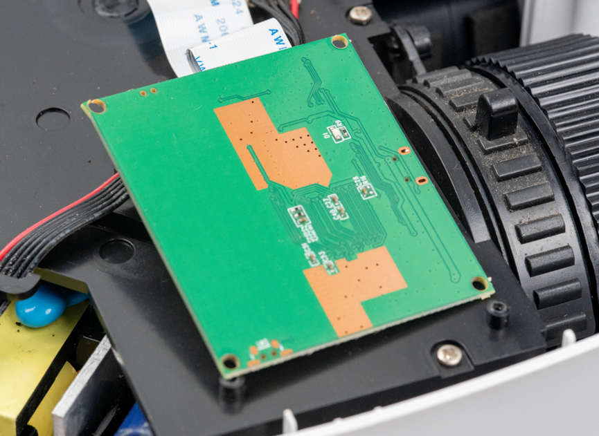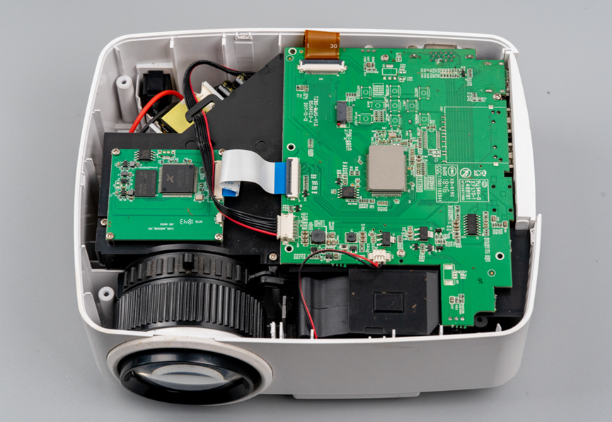 反射镜大约45度安装,镜子后面放置了这个投影仪的电源电路板。