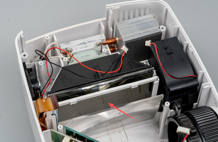 去掉黑色的壳子,可以看到里面东西就比较明确了,这并不是要给DMD投影仪。而是一个LCD投影仪。通过左边的LED光源,把中间的LCD图像通过右下角的斜置镜面折射,然后从镜头发射出去。