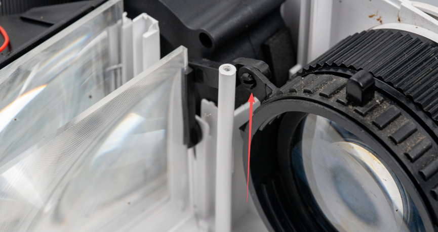 拍这张图的时候去掉了中间的LCD,LCD前面还有一个上面带纹理的面板。旋转镜头外面的可调环的时候,会通过一个连杆带动这个纹理面板,以此来调节画面畸变。