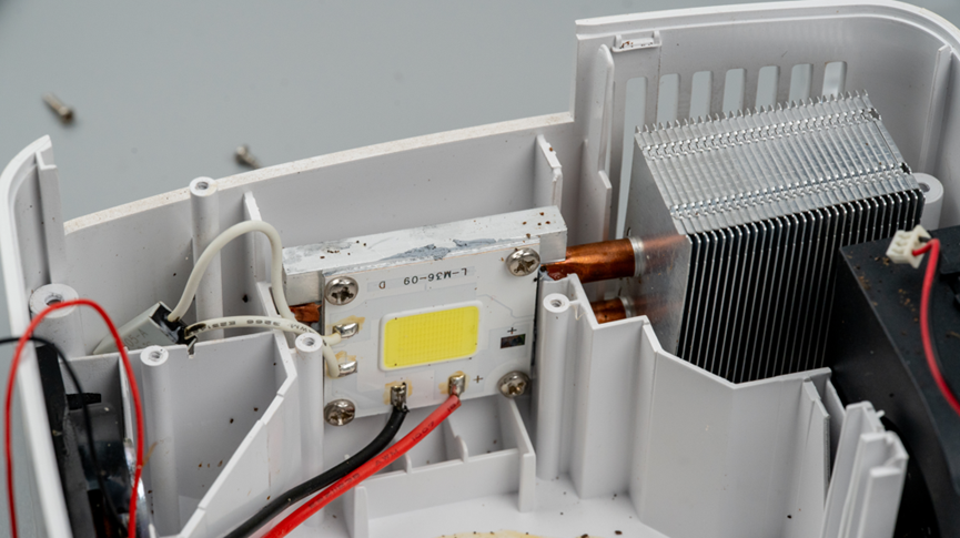 这就是这个投影仪的COB光源,这个光源板是铝基板,直接用螺丝固定在一个铝合金热沉上,然后天容国铜管把热量到铝合金散热翅片上,通过风扇吹动空气对流来加速散热。这种投影仪损坏,大概率是这个COB光源坏掉了,但是这种投影仪也没啥维修价值了,所以我直接选择放弃。