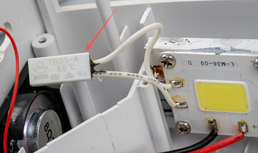 其实这个光源上还串联了一个常闭式温度开关,这个开关当温度超过80℃就会断开,从而切断COB光源的供电通路,实现光源过温度保护。