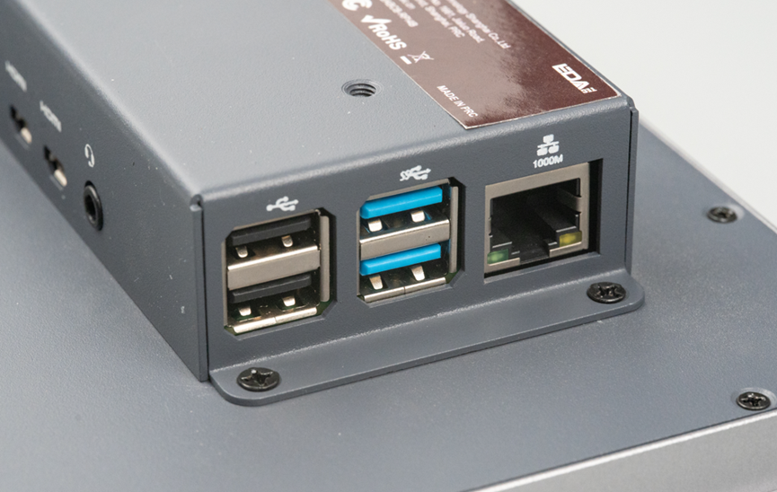 尾壳突起的这个盖子,一侧是两个USB2.0口+两个USB3.0口,另外还有一个千兆以太网接口。