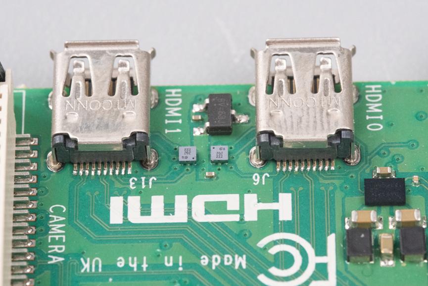 下侧面是供电输入的Type-C口。还有两个HDMI输出口,支持输出2路4K60P视频,这里采用的是Micro HDMI连接器。最右边还有一个音频输出接口。看着两侧的接口排布方式,莫不是里面直接采用了树莓派开发板?