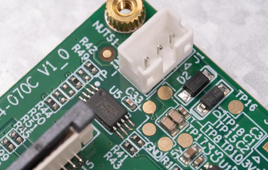 还有一颗EEPROM,型号是24C32A。板子四角焊接了四个滚花铜螺母。
