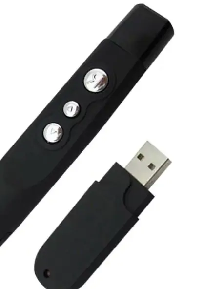 2.4G 翻页笔由一个 RF 射频遥控器与一个无线接收器(USB 接口)组成。RF 射频遥控器内嵌有无线 RF 射频发射器,在使用时只需要将接收器插入电脑主机的 USB 接口,无需安装驱动即可正常工作。使用者只需点击 RF 射频遥控器的相关功能键便可操纵接收器,并且发射器不用对准接收器,真正体现无线自由。