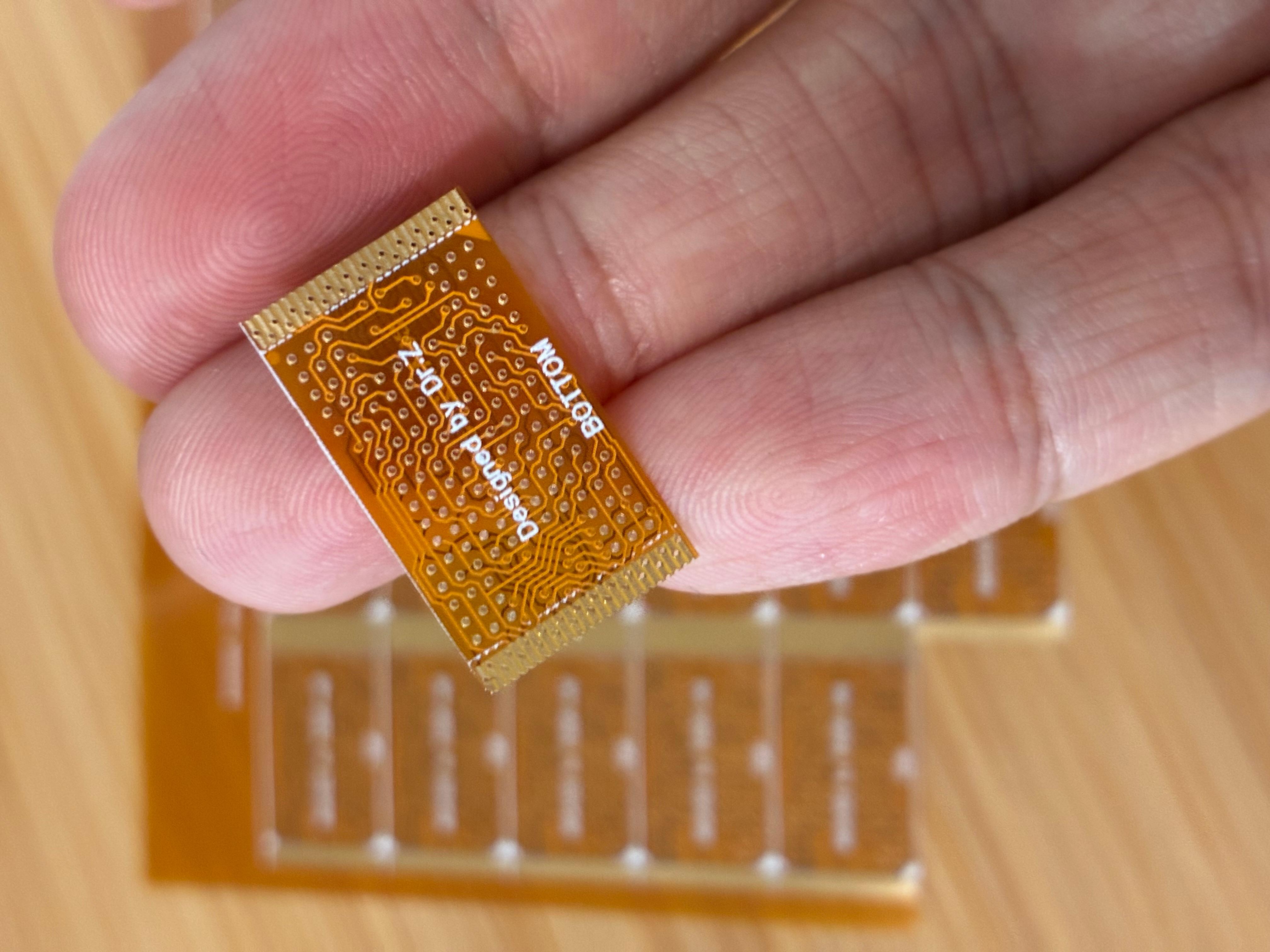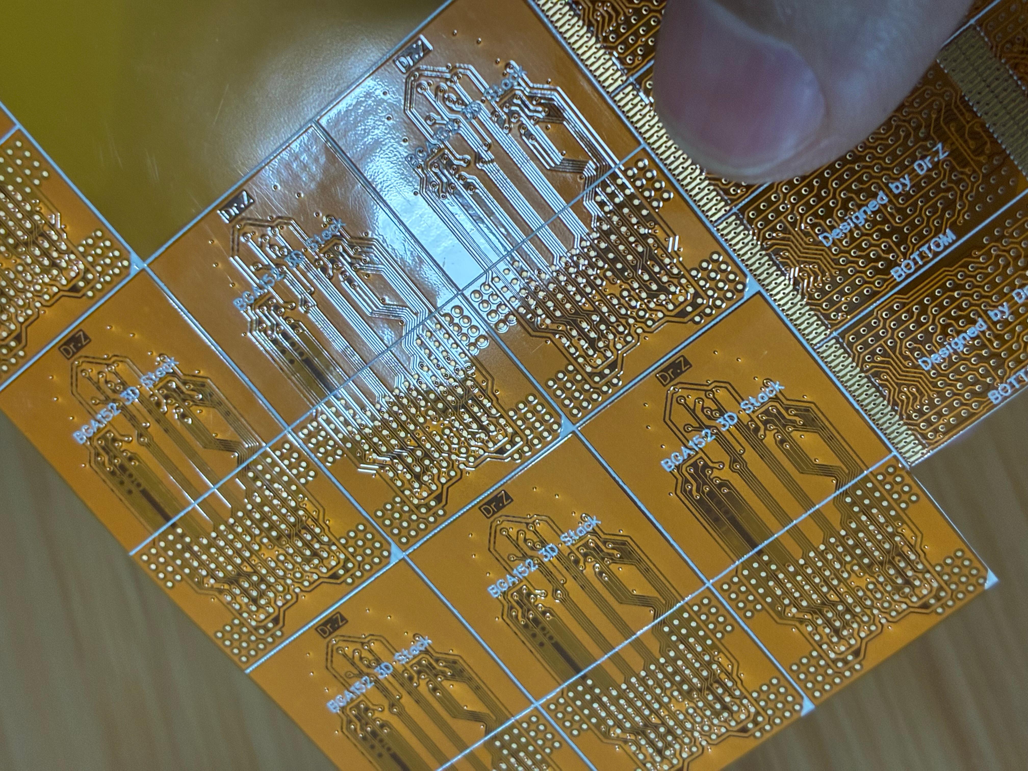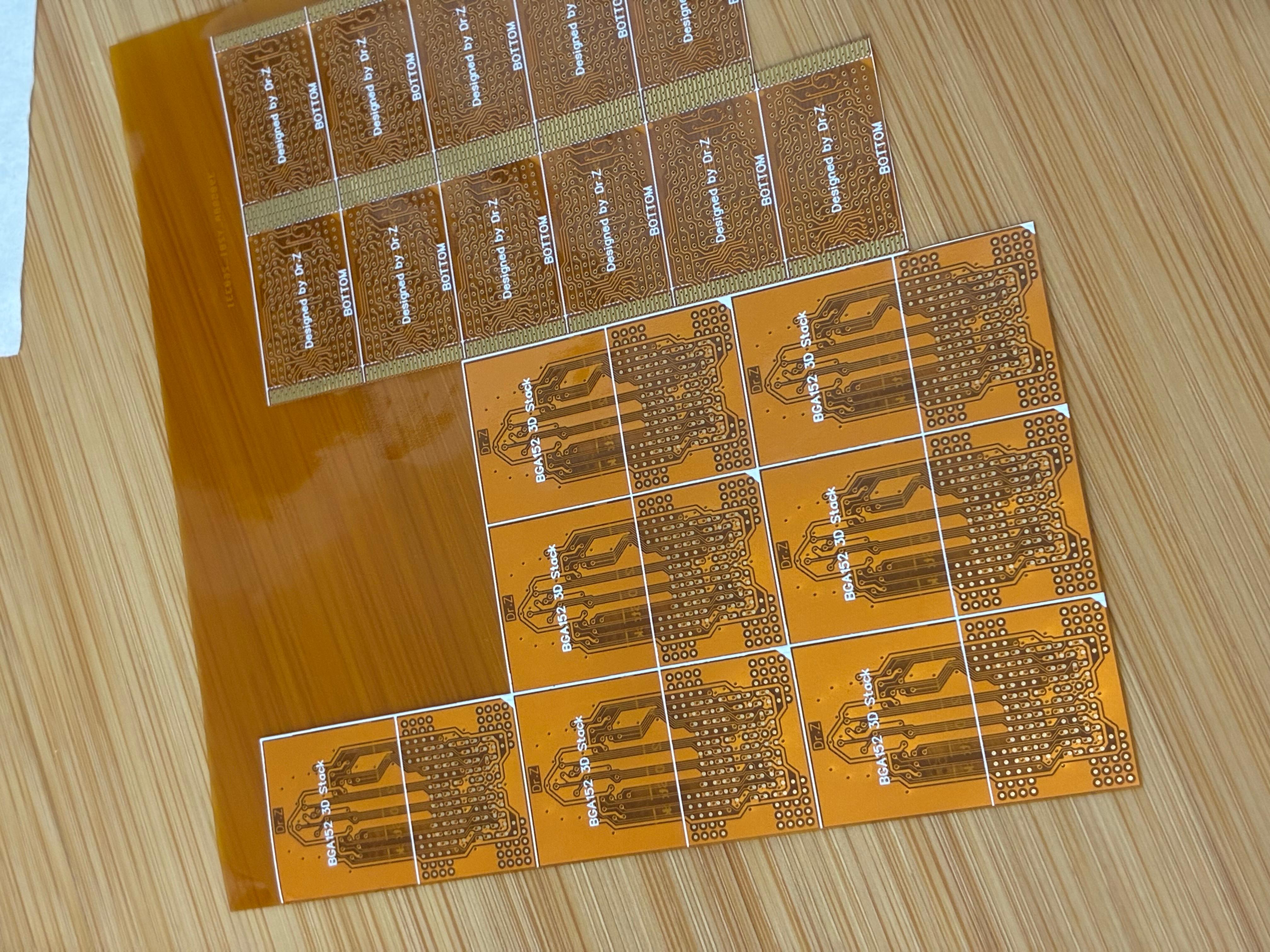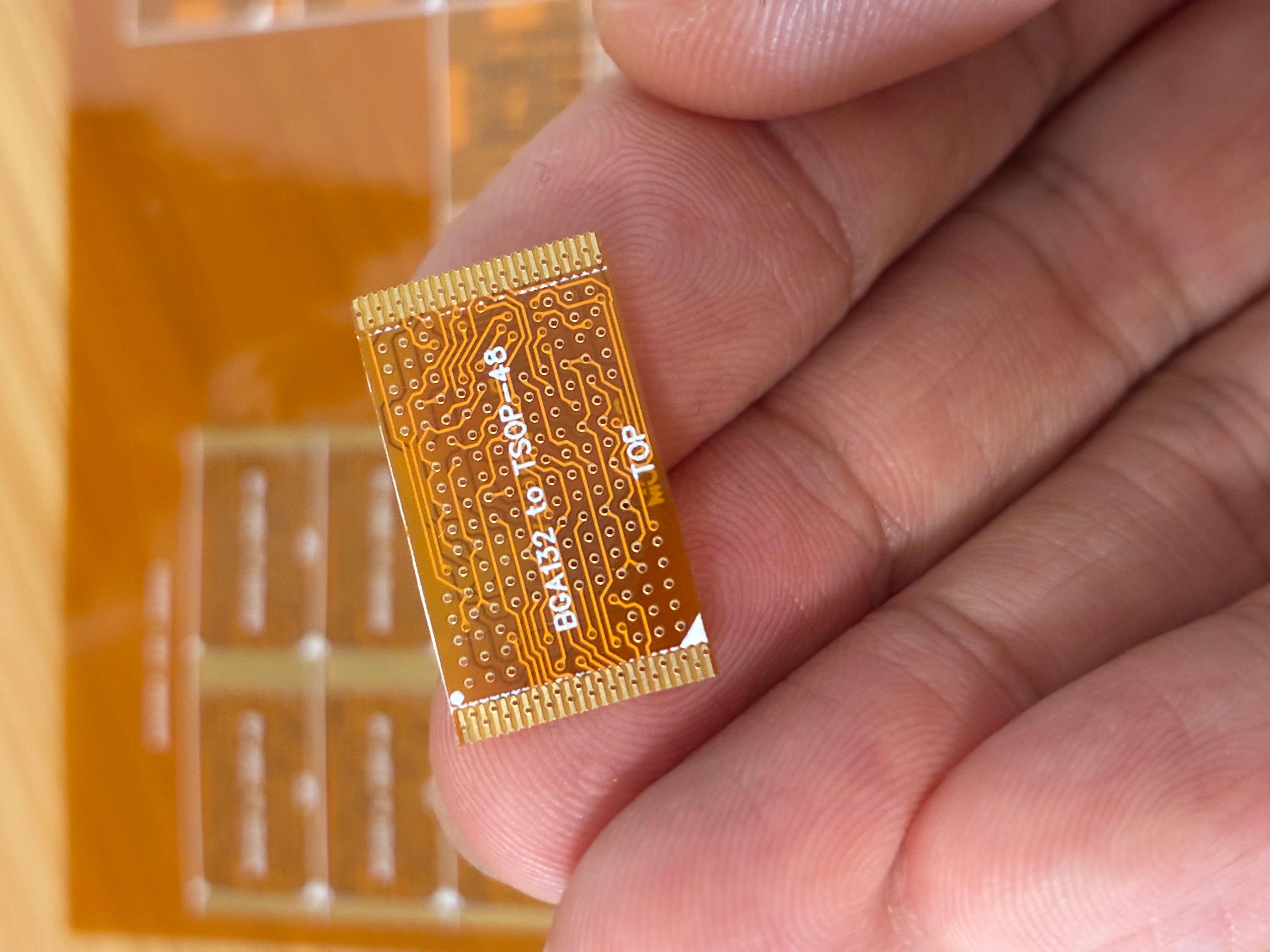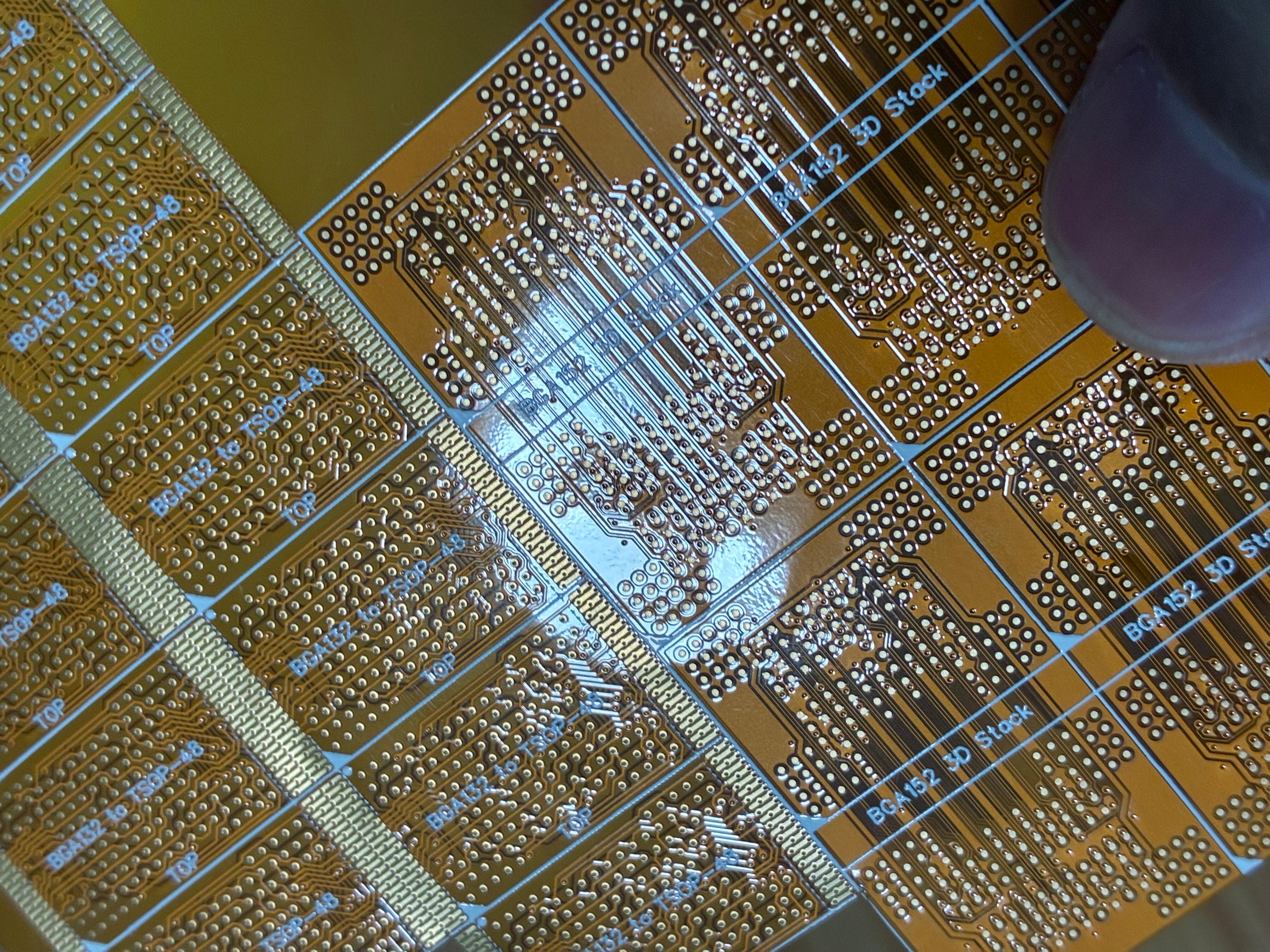 我是做存储行业的,总是要涉及到不同脚位的存储芯片转换。其中TSOP-48和BGA132的转换最让人头疼,特别是TSOP-48脚的特性,只能使用电烙铁焊接,所以不能用FR4板来做转换贴,只能用轻薄的FPC。这次终于下定决心要把转换贴画出来,随便做了BGA152的2+2CE二合一转接。经过嘉立创免费打样最终得到成品,质量出人意料的好!下面上高清大图: