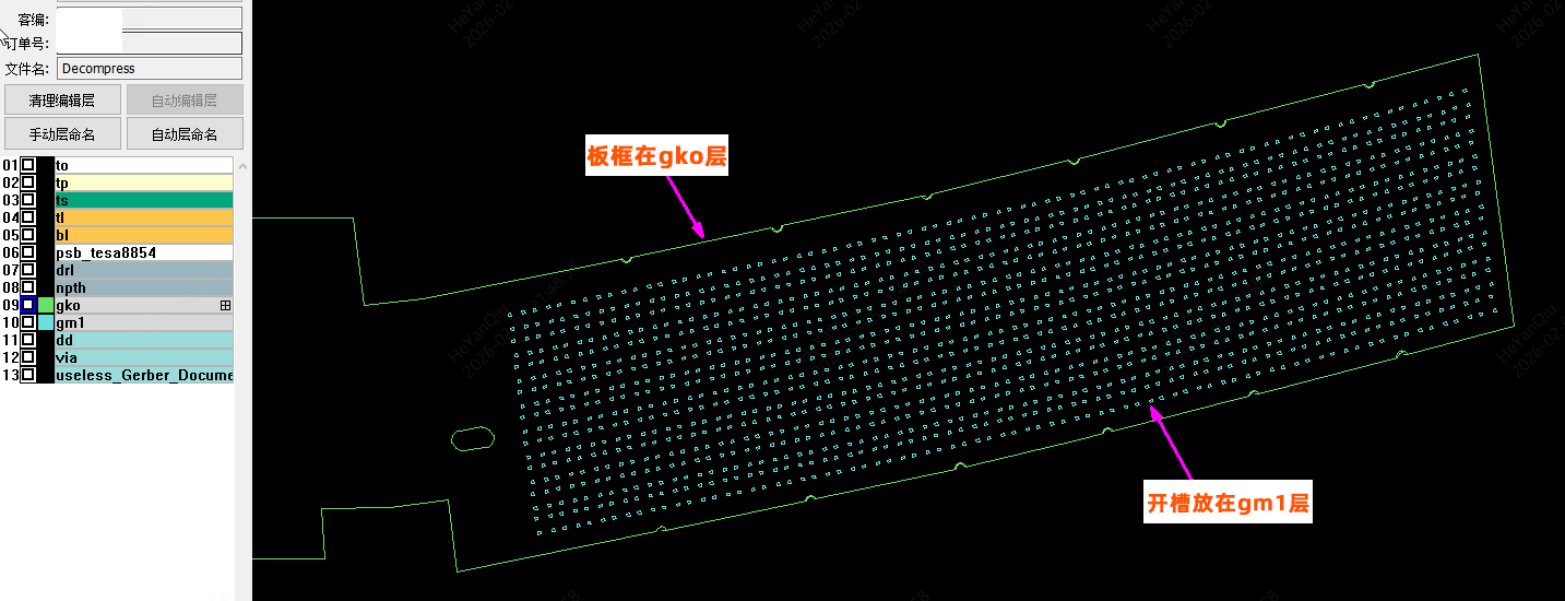问题:板框放在gko层,开槽放在gm1层,导致gm1层槽孔漏做,设计时板内槽孔或非金属化孔与外形层必须在同一层,且外形层必须唯一。