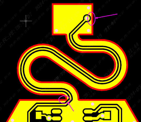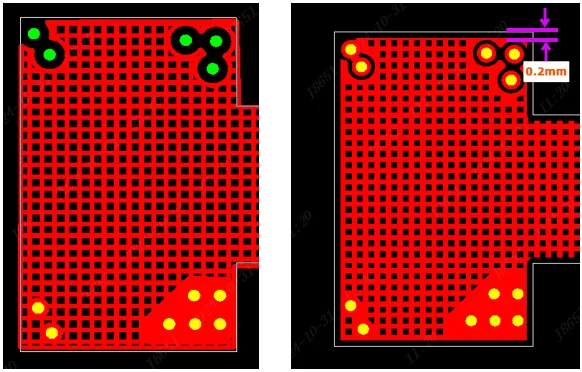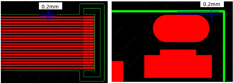 问题:图中覆铜与板框线平齐,CAM工程师处理资料时,将板边铜皮掏离板框0.2mm后会导致开路