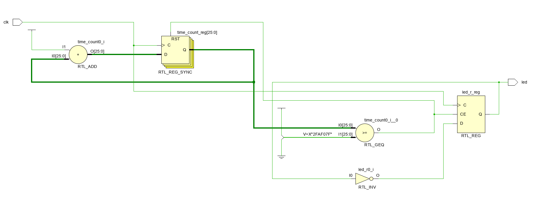 `timescale 1ns/1ps //时间单位:1ns,精度:1ps module LED ( input clk, output led ); parameter count_s = 26'd50_000_000; //50M晶振时钟,一个周期20ns reg [25:0] time_count = 26'd0; //时钟计数器,2^26 = 67108864 reg led_r = 1'b0; always@(posedge clk) if(time_count >= count_s - 1) begin time_count <= 26'd0; led_r <= ~led_r; end else time_count <= time_count + 1'b1; assign led = led_r; endmodule |