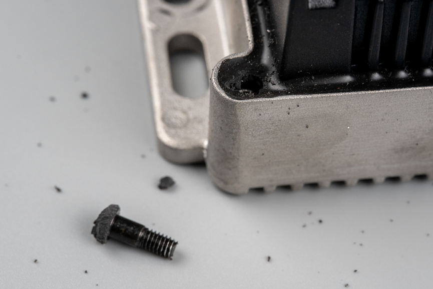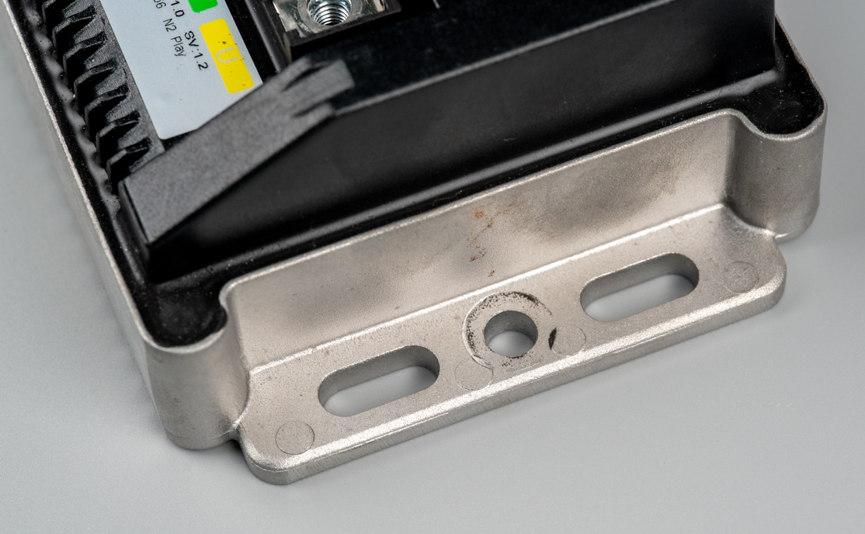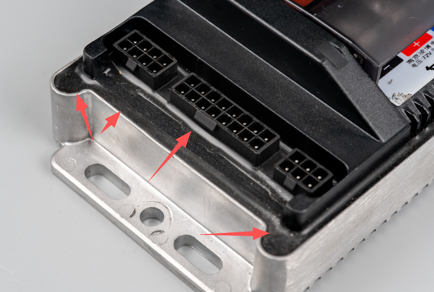 来看看这个控制器的防水方式。塑料盖子安装在铸铝底壳上之后,连接缝和螺丝孔都做了灌胶。塑料盖子的信号连接器开槽处,也做了灌胶。
