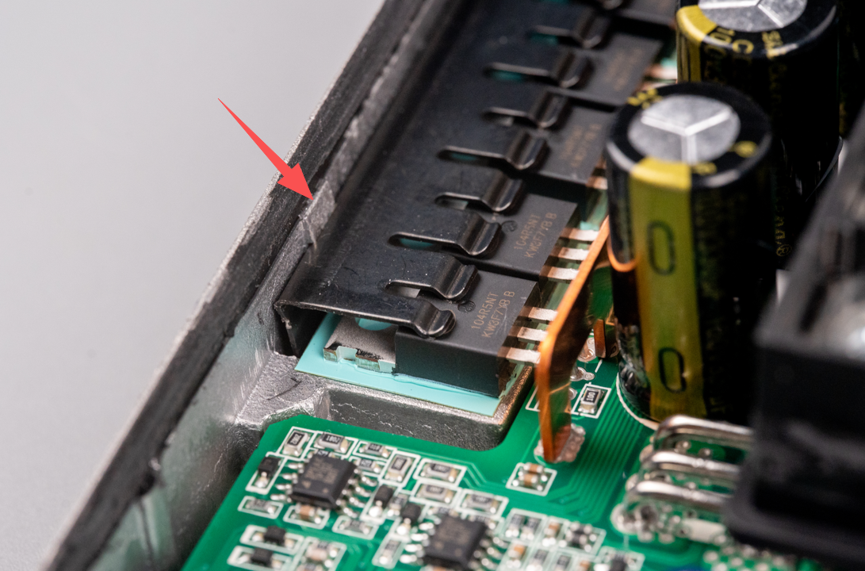 卡扣固定方式设计的挺不错,安装简单。铸铝壳体内壁生长了两个挡块,直接把卡扣用力按下去,就会被这两个挡块给卡住,从而可以让MOS管与底壳的散热凸台紧紧挨在一起,实现固定和散热。