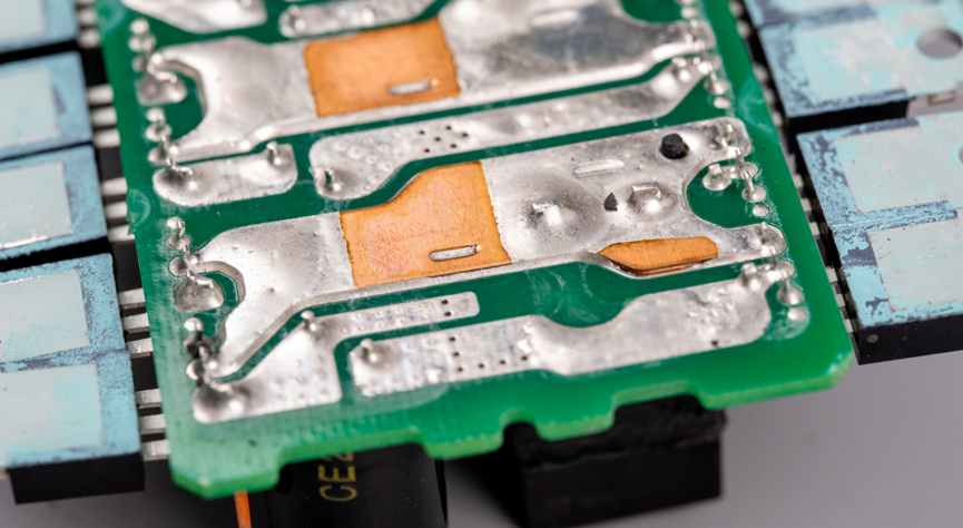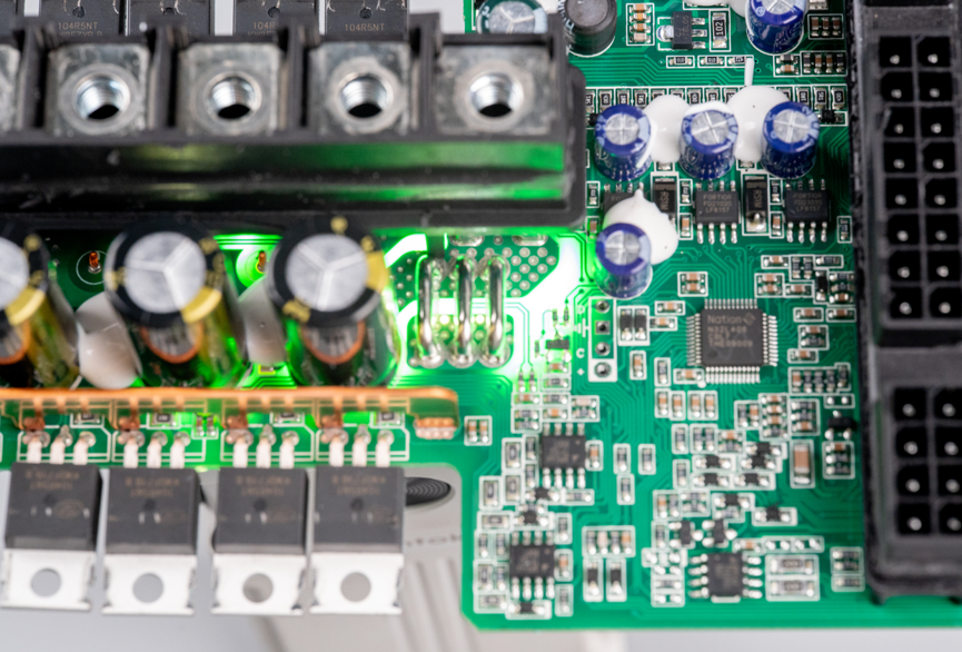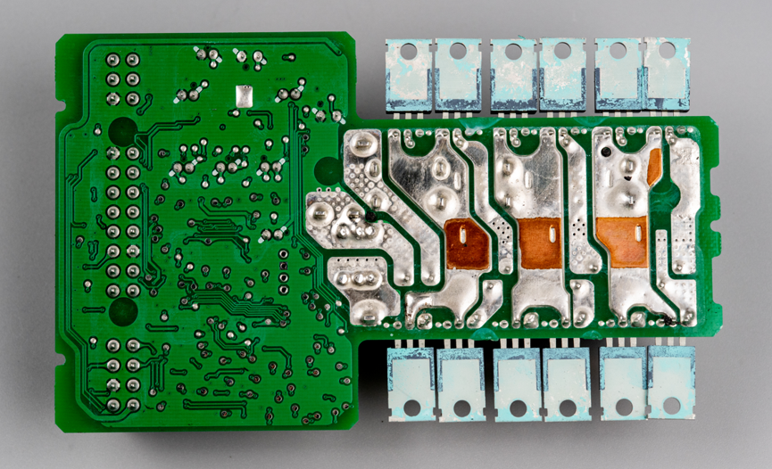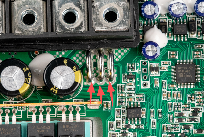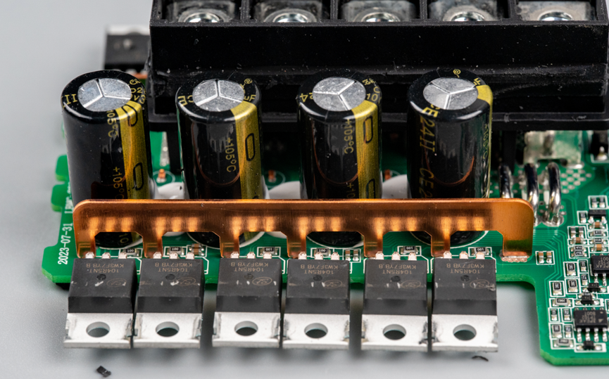 功率部分,一个桥臂的上桥臂两个MOS和下桥臂两个MOS分布在上下两侧,中间通过铜板扩流连接并引出UVW相线。
