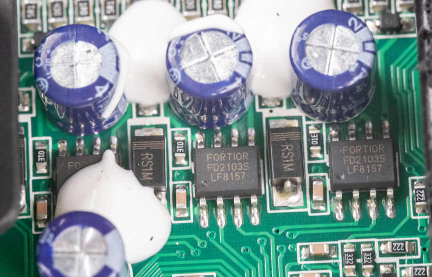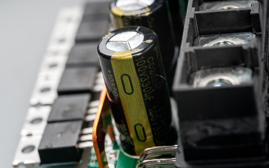 采用了四颗电解电容,耐压100V,容值330uF,这个安装方式比较尴尬,品牌丝印刚好被接线柱挡住看不到了。