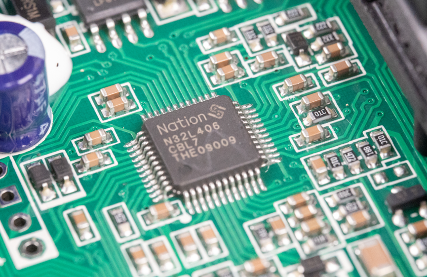 主控采用了国民科技的N32L406CBL7,这是一个ARM Cortex-M4内核的MCU,主频64MHz,支持浮点运算和DSP指令,Flash容量为128KB,RAM大小24KB。这个器件内置了一个12bit 的4.5Msps ADC,两路独立轨到轨运放,两个高速比较器,一个1Msps的12bit DAC,这些模拟特性使得它比较适合用来做FOC。