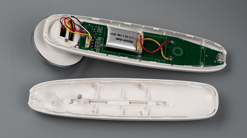 拆解方式为暴力撬开,开了之后发现所有的卡扣都损坏了,我发现这类美容仪产品在设计外壳的时候,就不想让你拆开。只要拆开,必定损坏,我拆过好几个同类产品都是这样的。