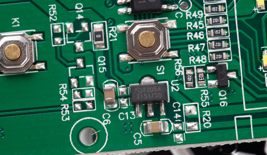两颗6x6的按键。一个SOT89封装的LDO,型号是ME6206A。