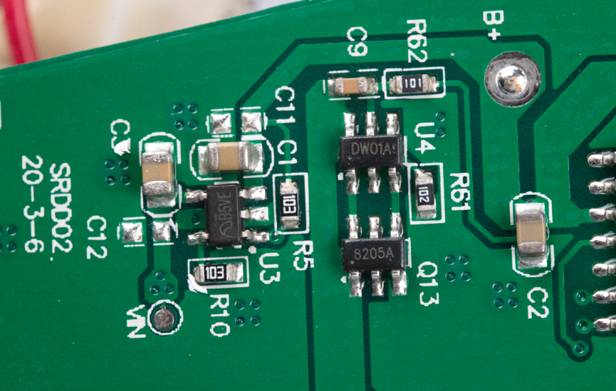锂电池保护芯片放在了板子上,保护芯片的型号是DW01A,MOS管型号8205A,这里面集成了两个MOS。左边还有一颗来自南京微盟的锂电池充电芯片ME4075。