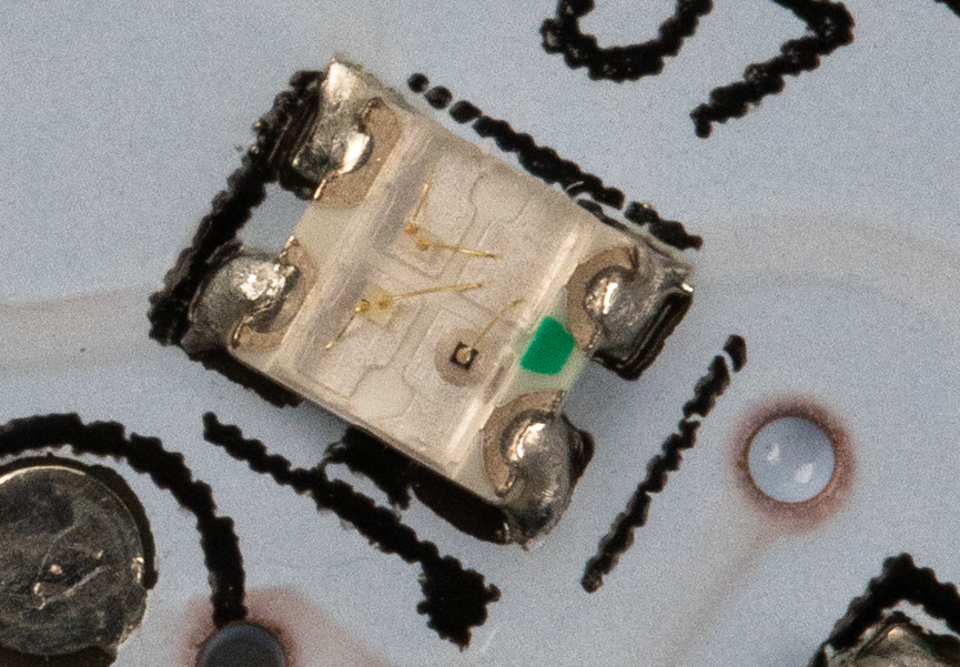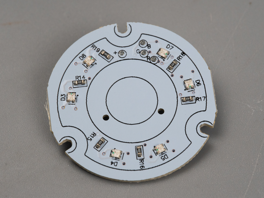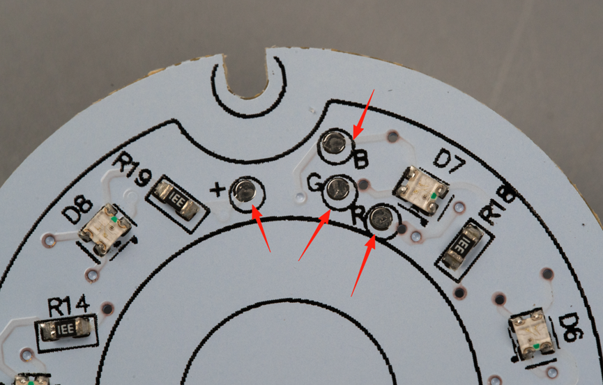 所以板子后面的四根线就是R、G、B、Vcc四个信号了。六个灯的相同颜色是并联在一起的。