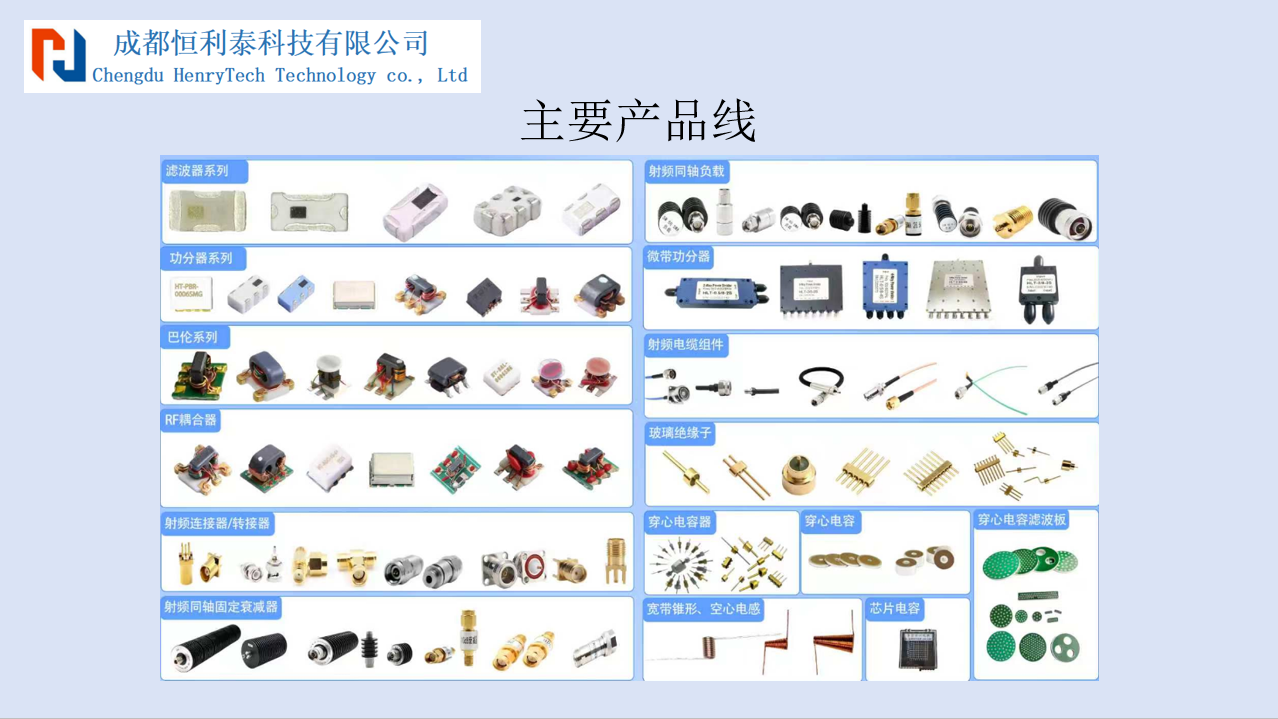 目前,恒利泰已搭建20多条产品线、2000+活跃现货型号。产品覆盖射频变压器/巴伦、功分器/合路器、耦合器、滤波器、射频连接器、电缆组件、玻璃绝缘子、宽带电感、电容等品类无源器件,广泛应用于通信、工业、医疗、航天航空、卫星通信、测试测量等领域。