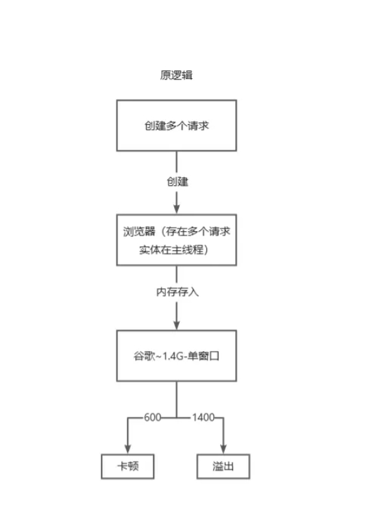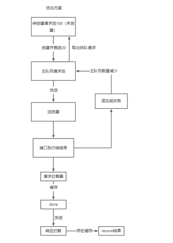 针对此模式,我们可以创建如下序列,待发送请求池作为中间层,只作为载体,每次推送固定数量到浏览器,当浏览器主线程中存在接口执行完毕后,代表主线程中接口数量减少,在从待发送请求中取出新的接口放入主线程,从而实现控制主线程发送数量避免内存溢出
