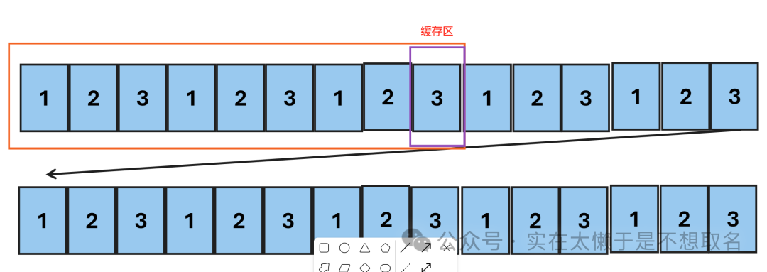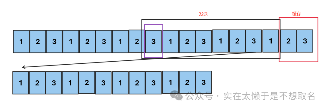 当我们发送3次“123”时才能让接收的字符>=8,我们把前八个发送了出去,此时缓存区剩下了一个字符是“3”