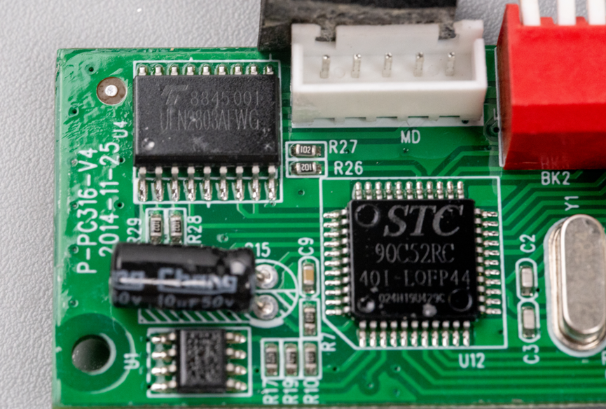 使用的主控芯片是STC90C52RC。驱动步进电机的是东芝的ULN2803AFWG,这是一个达林顿晶体管阵列。