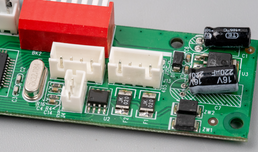 这是485通信接口电路,采用了两个TVS和两个自恢复保险丝。看了说明书上,这个485通信采用了PELCOD-D协议,波特率只有2400bps,这个协议我也是第一次听说。