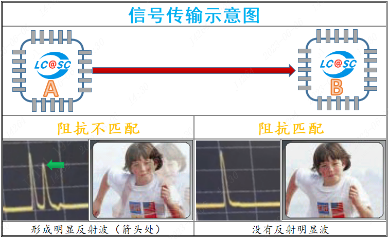 如上图,信号从信号源A输出,经过中间的传输线进入到接收端B。在传输过程中三者内部会有一些寄生的电阻,电容,电感,对高速线号的传输产生阻碍的作用。当信号在这3者间传输时,如果相邻部分的阻抗不一致,信号就会在接触点发生反射,从而导致信号失真。