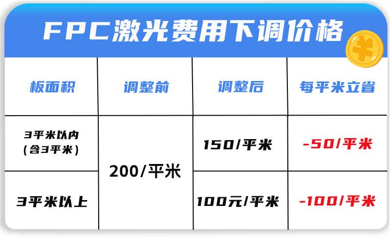 为了回馈客户,我们决定直接让利,对FPC激光成型费用进行下调,具体如下: