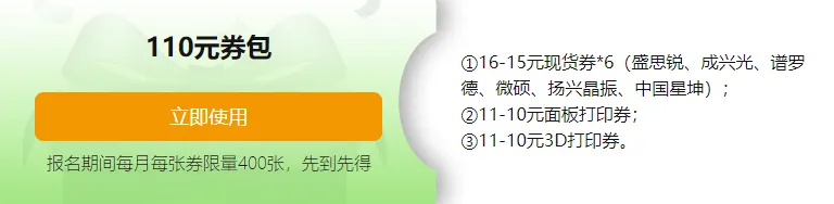 为支持参赛者创作,报名大赛就送110元券包,内含元器件券、面板打印券、3D打印券。每月每张券限量400张,先到先得。