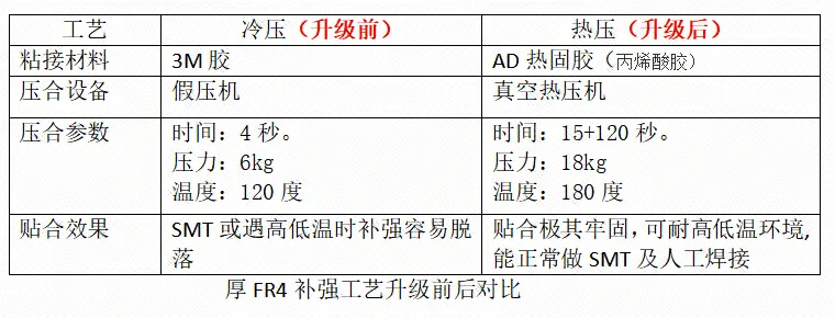 之前只有0.1mm和0.2mm的厚度采用热压,从即日起,0.4mm及以上厚度的FR4补强全部升级为热压贴合工艺。