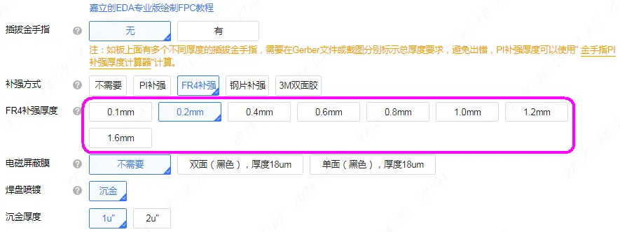 嘉立创FR4补强支持0.1mm,0.2mm,0.4mm,0.6mm,0.8mm,1.0mm,1.2mm,1.6mm共8种规格。