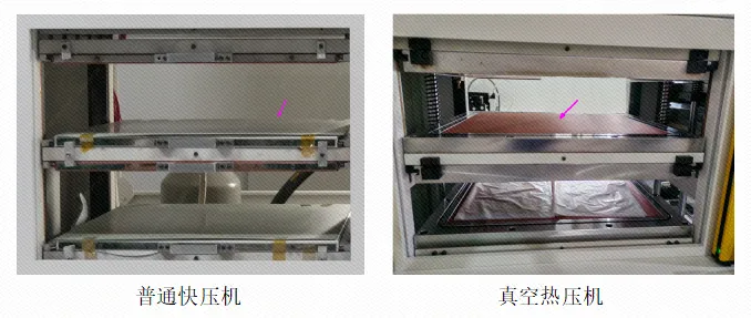 答:真空压机是多了气囊,压合时先抽掉板内空气,再往气囊内充满带压力的气体,来实现压合。普通快压机是直接通过平整的钢板来实现压合。