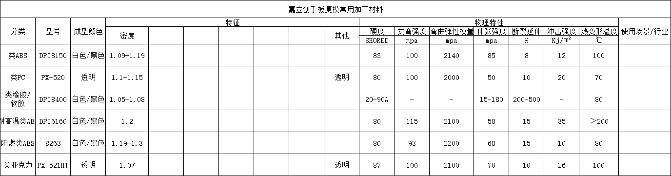 下表为嘉立创手板复模目前备有存货的加工材料: