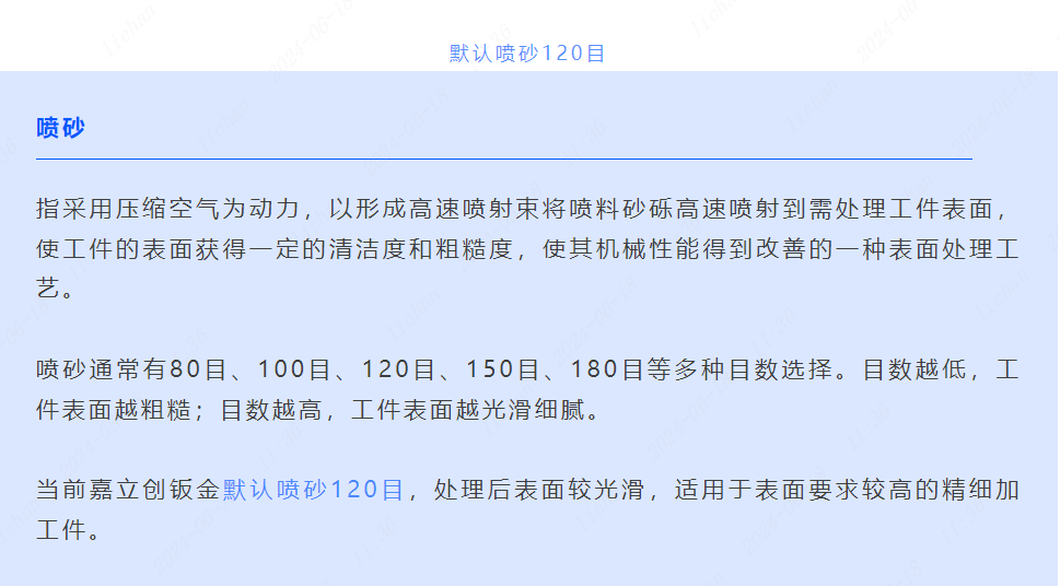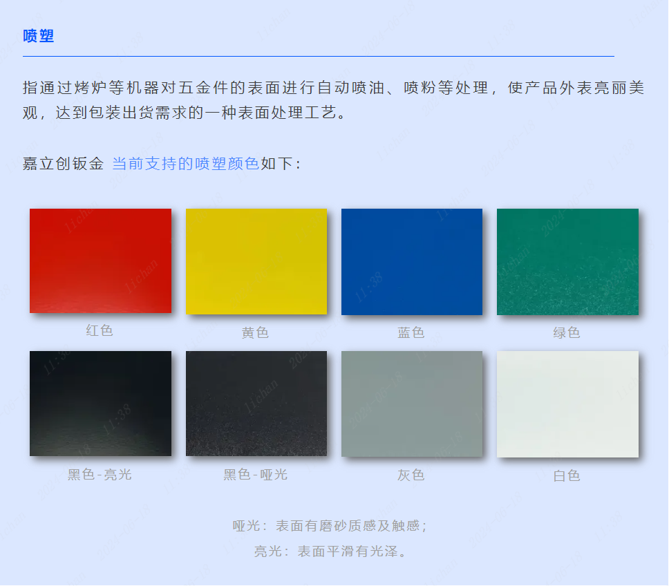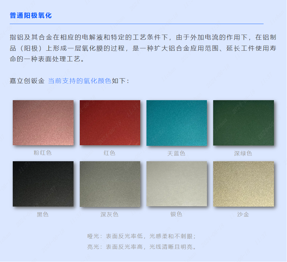 常用表面处理工艺有拉丝、喷塑、普通阳极氧化、丝印及激光打标等,能够覆盖大多数钣金件表面处理需求。