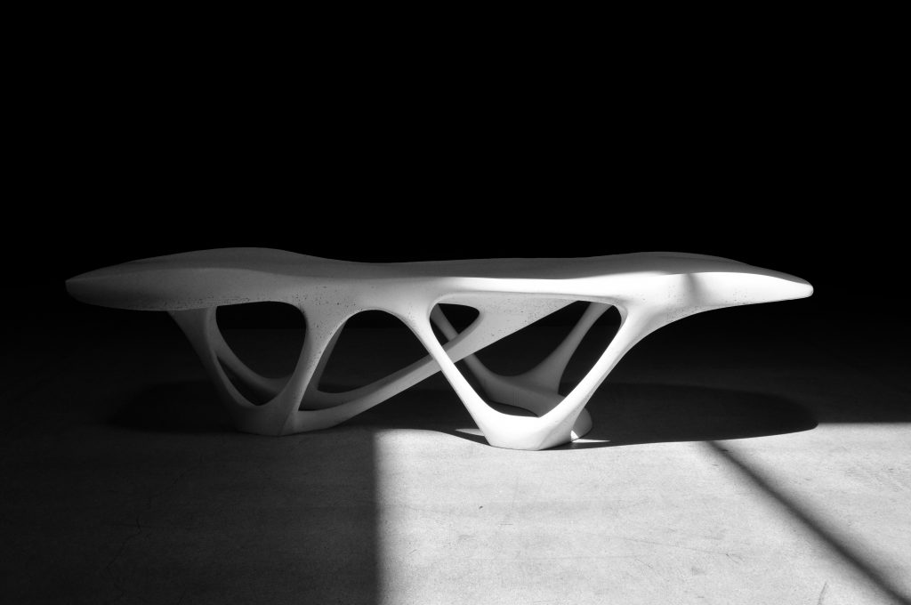 Slicelab,一家位于美国的实验设计工作室,成功运用3D打印技术制造了一种新型混凝土桌子——精致的密度表。这款桌子展现了外星般流畅的形态,完全由白色混凝土浇铸,重86公斤,尺寸1525 x 455 x 380毫米。