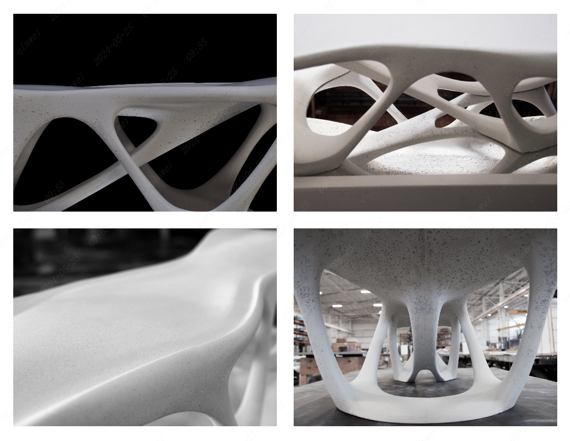 桌子模具被3D打印为23个单独组件,减少了支撑结构的使用,并简化了装配过程。模具设计独特,倒置填充混凝土,确保了桌面纹理的完美无瑕。最终,桌子的表面光洁度模仿了3D打印的层线,经过金刚石垫湿式打磨后,呈现出镜面般的光泽。
