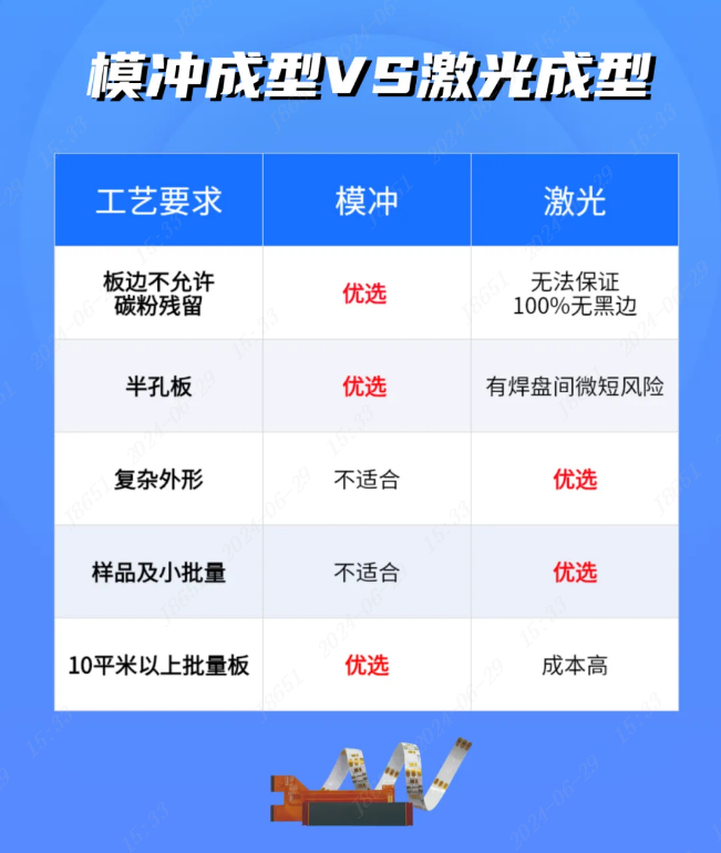 模冲:没有激光碳粉残留问题,半孔板也不会有半孔焊盘之间微短问题,可配自动冲床,生产效率高,成本低,但要开模具,适合大批量板。