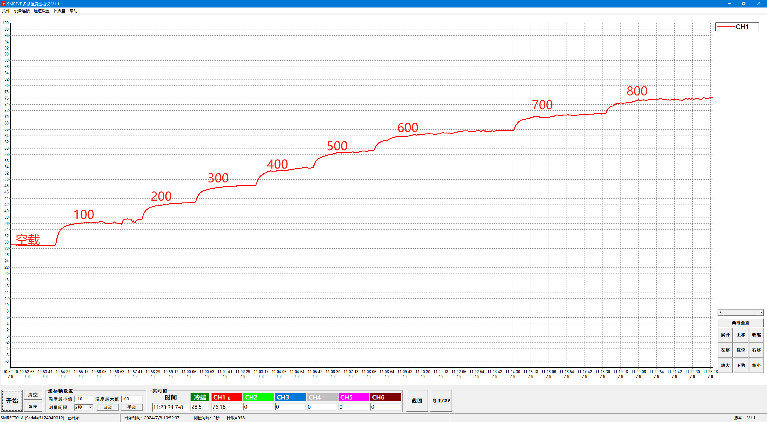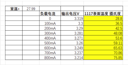 5V电压输入,3.3V输出,热电偶贴到1117表面,上位机检测温度曲线,方便测试100mA、200mA、300mA、400mA、500mA、600mA、700mA、800mA时的温升情况。