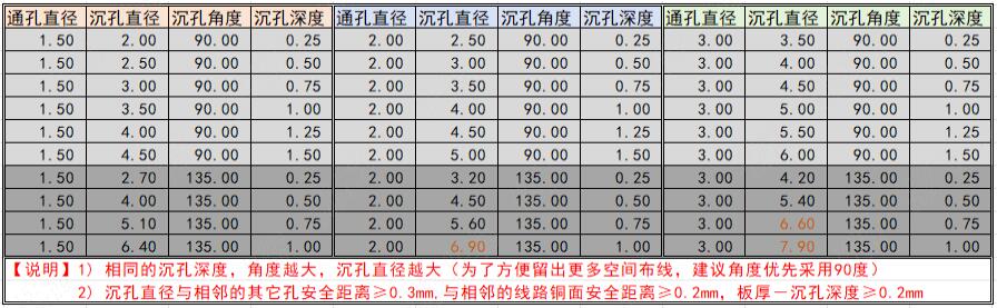 1)沉孔直径:沉孔直径需要距周边的焊盘、线路、铜面等保证最小0.2mm的间隙,以避免加工沉孔时伤到焊盘、线路、铜面等