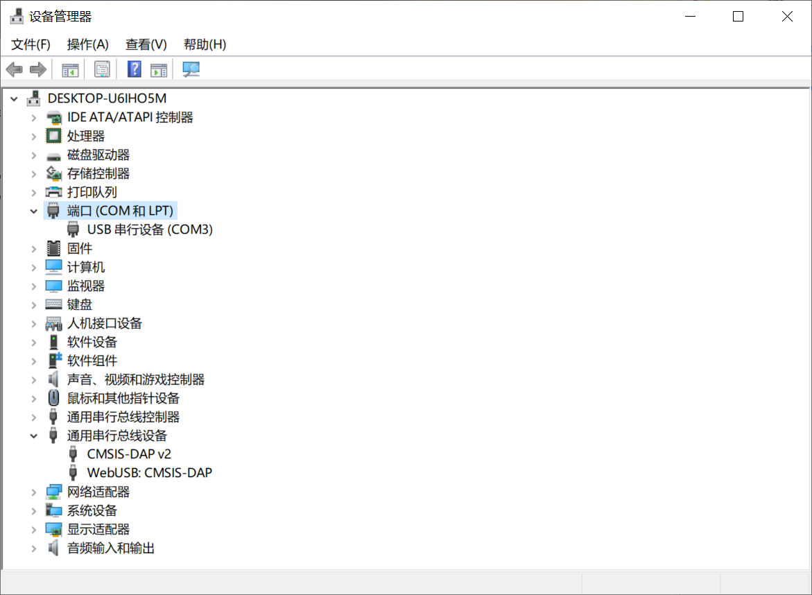 DAPLink 官方固件代码稍微改改适配下引脚定义,然后重新编译即可刷到地阔星开发板,刷完 DAPLink 固件后设备管理器显示效果: