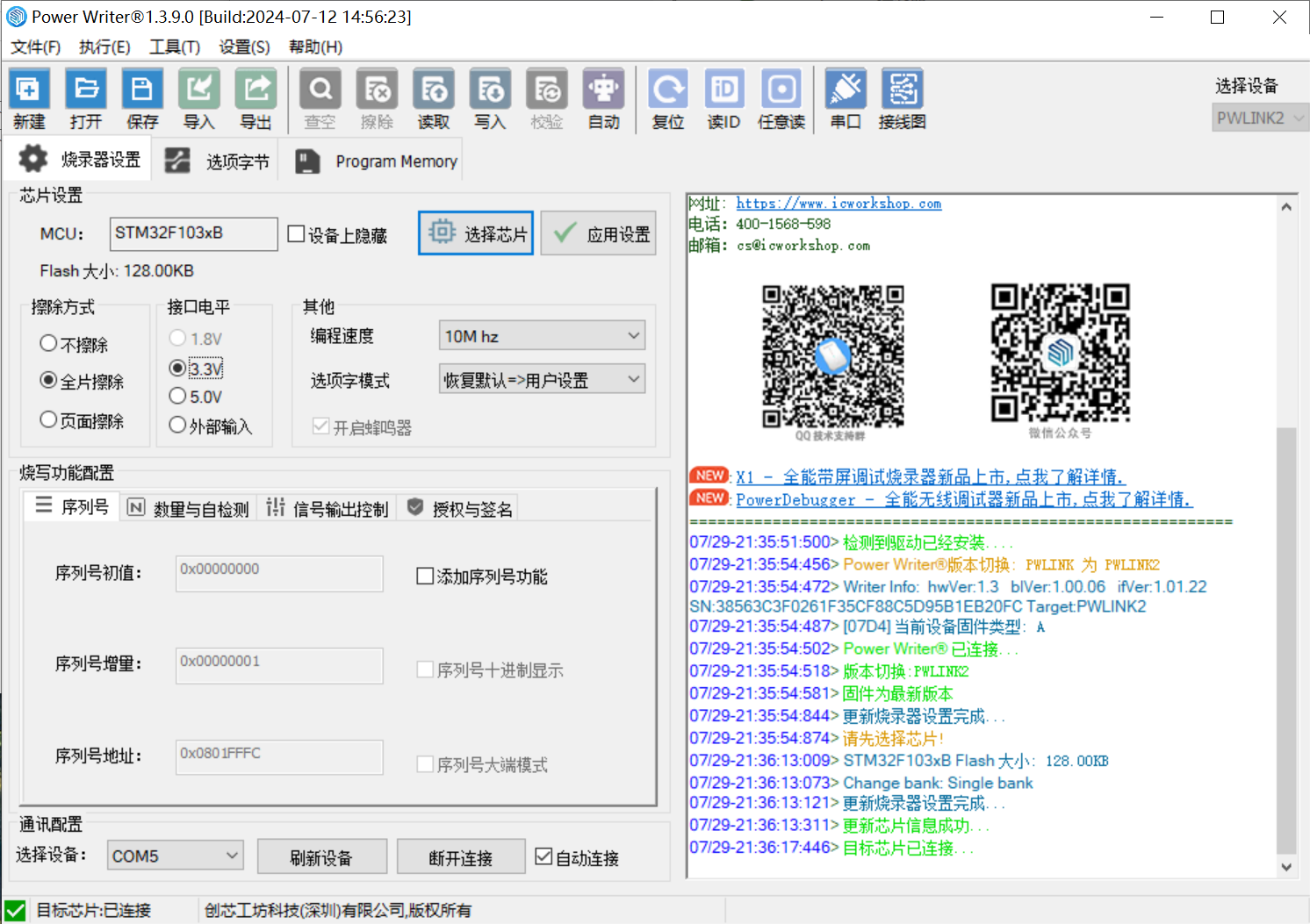 我这里用的是 PWLINK2 来测试的,芯片选择 STM32F103xB 即可读写 128K Flash,然后再 Program Memory 选项卡下加载一个事先制作好的 128K 的文件,写入到设备后再读取出来比对文件哈希即可,如果哈希一致那就说明这个 C8T6 设备实际上是有 128K Flash 可以使用的。