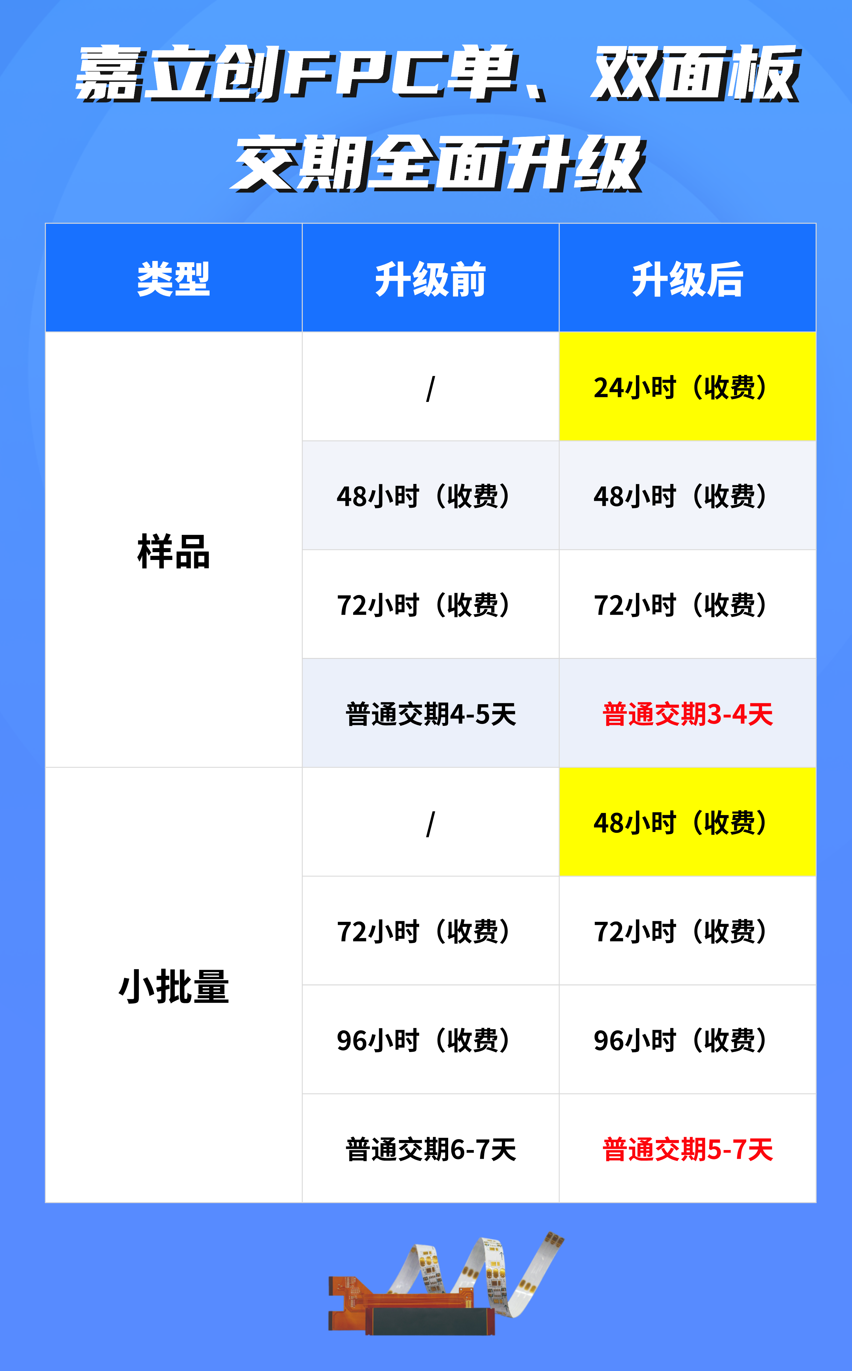 嘉立创为配合客户缩短研发周期,从即日起,FPC样品增加24小时加急,小批量增加48小时加急服务,且普通交期不管样品还是小批量全部提前1-2天交付。