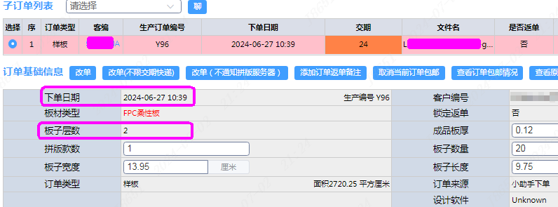 客户下一款双面板FPC,20大片,PI补强+钢片补强,6月27号10:39分下单,15:38分确认EQ并下发MI,6月28号13:12分完成发货,用时21时26分。