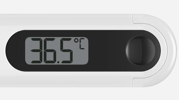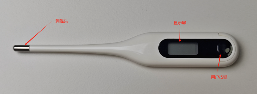 这个产品的设计非常圆滑,曲线很漂亮。测温头部分是金属的,正面有一个小小的显示屏和用户按键,这基本上就构成了一个有输入、有输出、有测量、有计算的典型的电子系统。