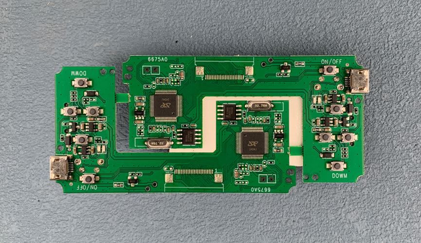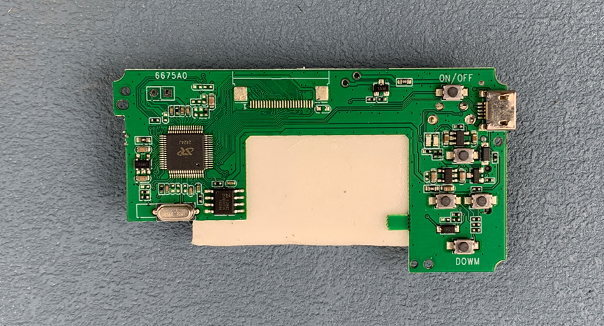 板子正面右边是一颗LQFP-64封装的芯片,看logo是我不认识的。这颗芯片完成了相机的全部功能。左边是蜂鸣器驱动、电源电路、按键电路等。