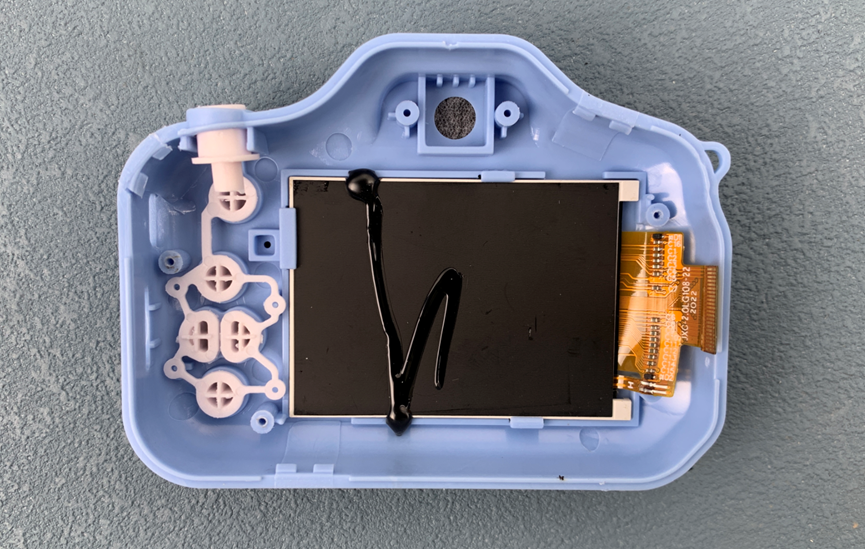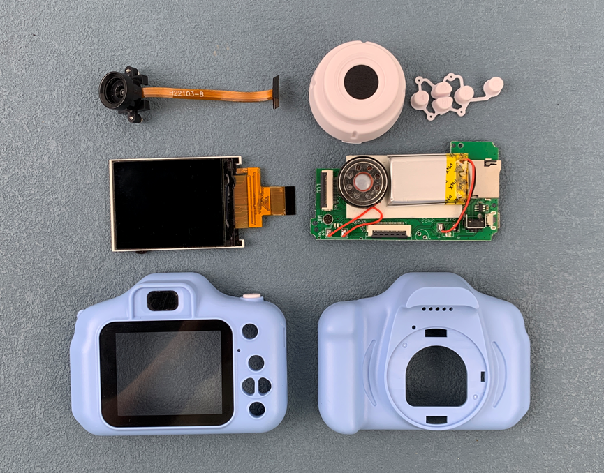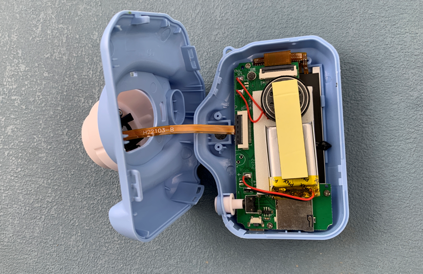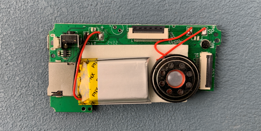 拆掉固定电路板的三颗螺丝,掏出电路板。这是板子背面,上面有拍照按键、SD卡座、蜂鸣器、电池、屏幕和摄像头排线连接器。