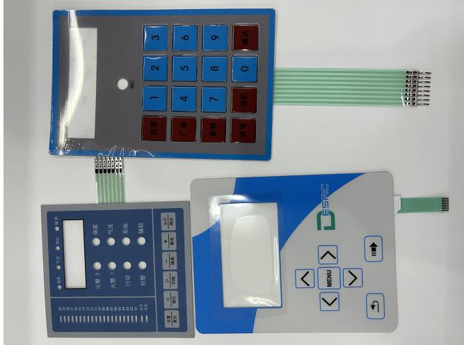 按下薄膜开关,上电路的触点向下变形,与下电路的极板接触导通,手指松开后,上电路触点反弹回来,电路断开,回路触发一个信号。